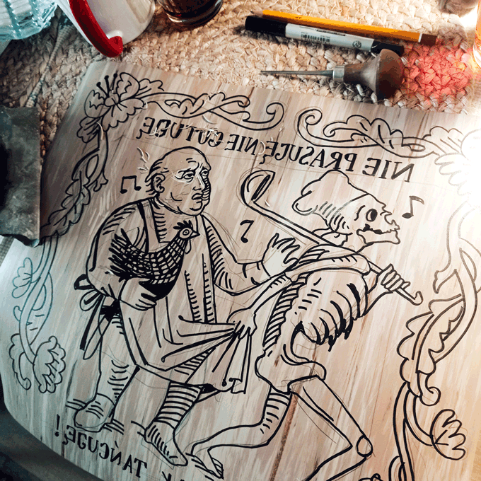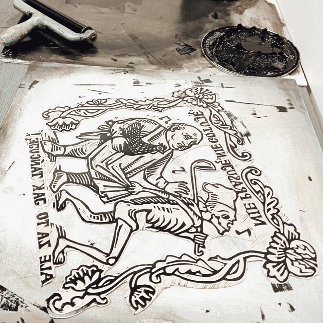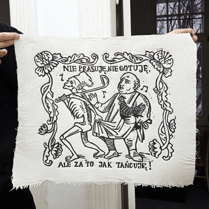 Makatka bawełniana o formacie około 45x38 cm z naszym odręcznie odbitym nadrukiem z matrycy linorytniczej przedstawiającym ilustrację "Danse Macabre". My cięliśmy materiał i go krochmaliliśmy. Przez to, że każda makatka odbijana jest osobno, każdy egzemplarz może się od siebie nieznacznie różnić. Wydruk został wykonany drukarską farbą offsetową. Faktura materiału może być lekko nieregularna, tak, jak to widać na zdjęciach. Kolor to naturalna bawełna (więc nie czysta biel). Makatka nie nadaje się do prania.