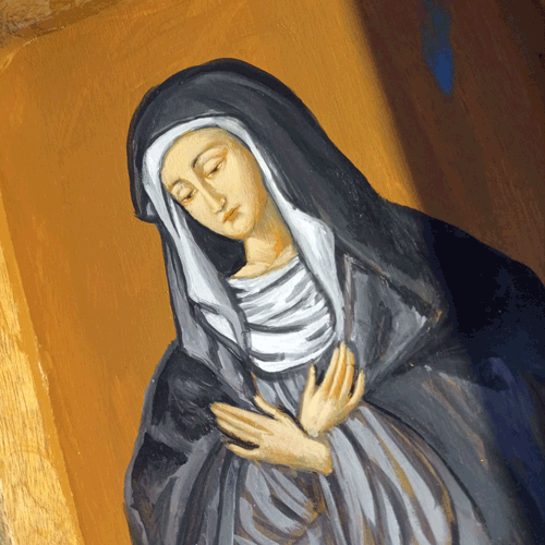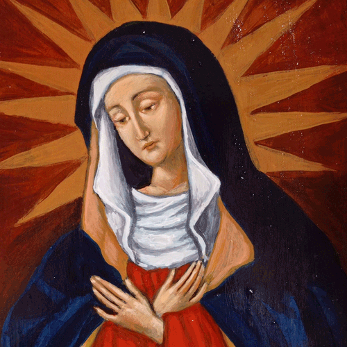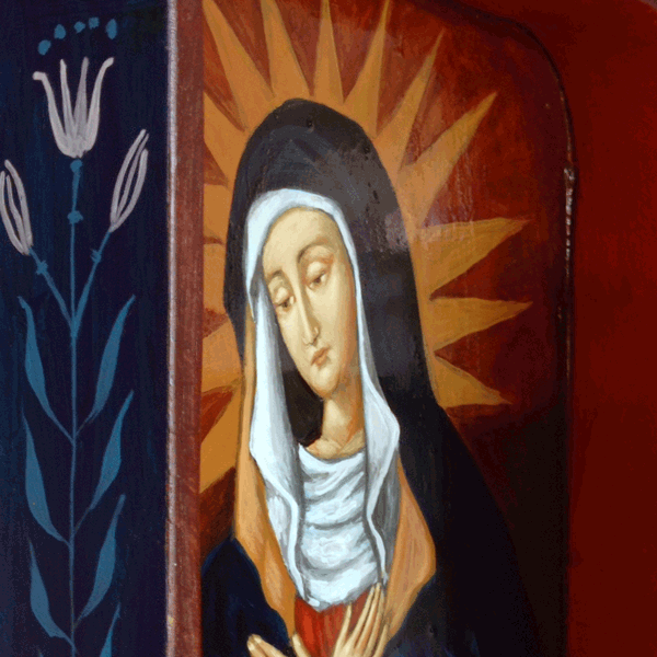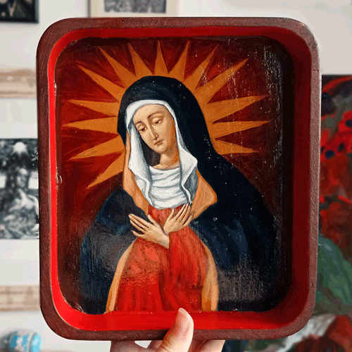 Ikona w formie kapliczki przedstawiająca Matkę Bożą Ostrobramską o formacie 22x18,4x2 cm. Na obrazie widać ślady pędzla i gródki farby, które są naturalną pozostałością procesu. Obraz jest zabezpieczony werniksem matowym. Kolory na zdjęciu i w rzeczywistości mogą się nieznacznie różnić.
