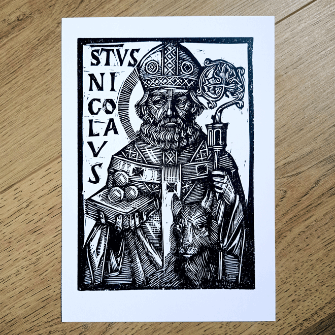 Odbitka linorytcznia z przedstawieniem św. Mikołaja Cudotwórcy. Odbitki posiadają marginesy maksymalnie do formatu A5. Każda odbitka nieznacznie się od siebie różni.