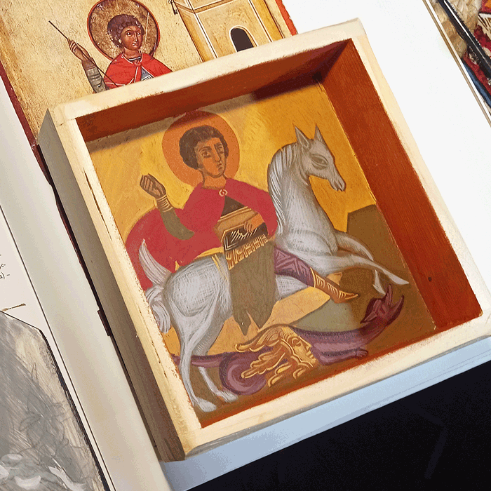 Ikona w formie kapliczki przedstawiająca św. Jerzego walczącego ze smokiem o formacie 15x15x3 cm. Na obrazie widać ślady pędzla i gródki farby, które są naturalną pozostałością procesu. Obraz jest zabezpieczony werniksem matowym. Kolory na zdjęciu i w rzeczywistości mogą się nieznacznie różnić.