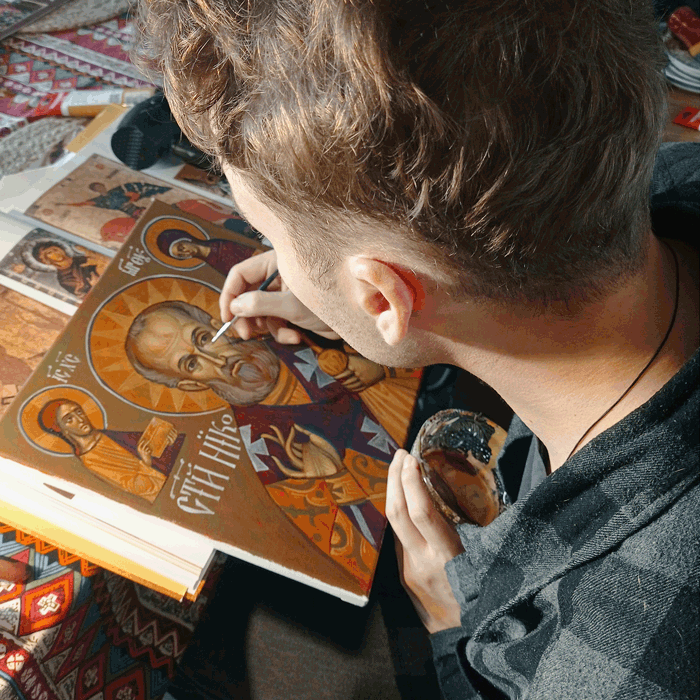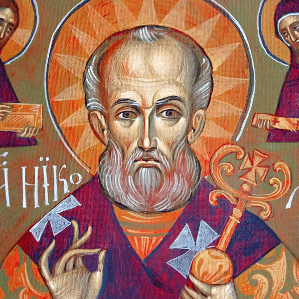 Ikona przedstawiająca postać Świętego Mikołaja, Chrystusa oraz Matkę Bożą o wymiarach (z ramą) 32x32x4 cm namalowana na płótnie z ręcznie wykonaną ramą. Na obrazie widać ślady pędzla i gródki farby, które są naturalną pozostałością procesu. Obraz jest zabezpieczony specjalnym werniksem. Kolory na zdjęciu i w rzeczywistości mogą się nieznacznie różnić.