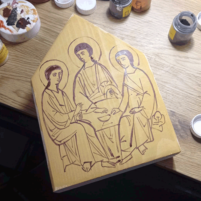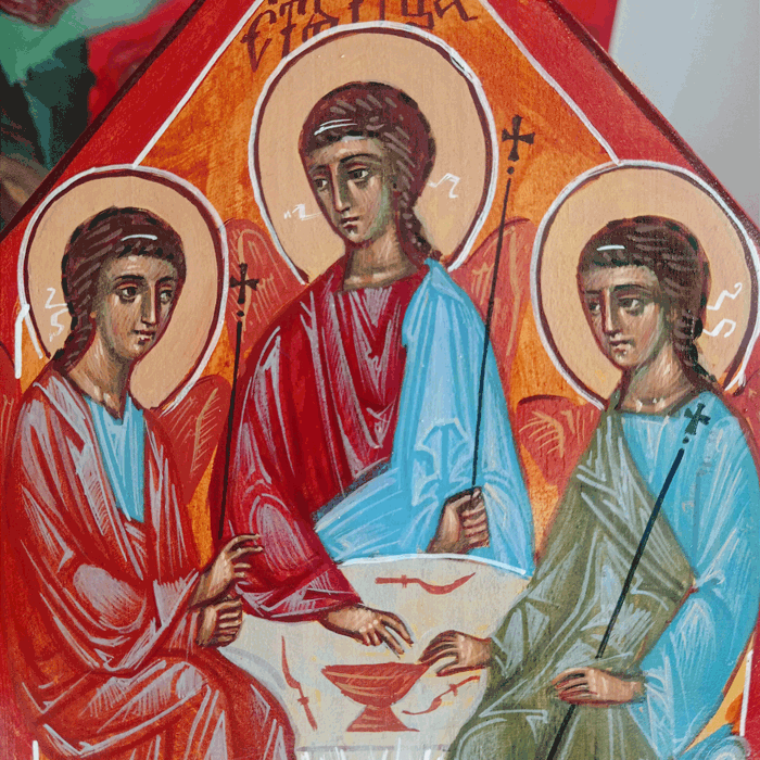 Ikona w formie kapliczki przedstawiająca Trójcę Świętą Rublowa o formacie 21x15x3 cm. Na obrazie widać ślady pędzla i gródki farby, które są naturalną pozostałością procesu. Obraz jest zabezpieczony werniksem matowym. Kolory na zdjęciu i w rzeczywistości mogą się nieznacznie różnić.