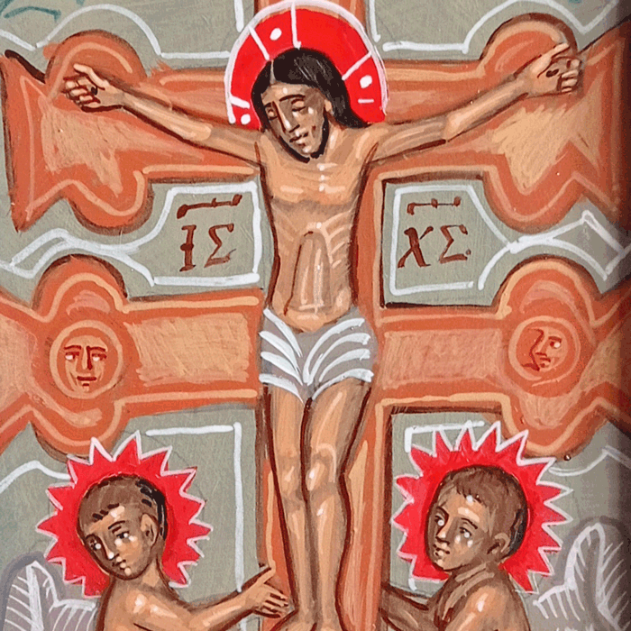 Ikona przedstawiająca scenę Ukrzyżowania o wymiarach (z ramą) 19,5x14 cm namalowana na płótnie z ręcznie wykonaną ramą. Na obrazie widać ślady pędzla i gródki farby, które są naturalną pozostałością procesu. Obraz jest zabezpieczony specjalnym werniksem. Kolory na zdjęciu i w rzeczywistości mogą się nieznacznie różnić.
