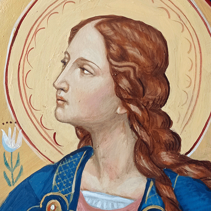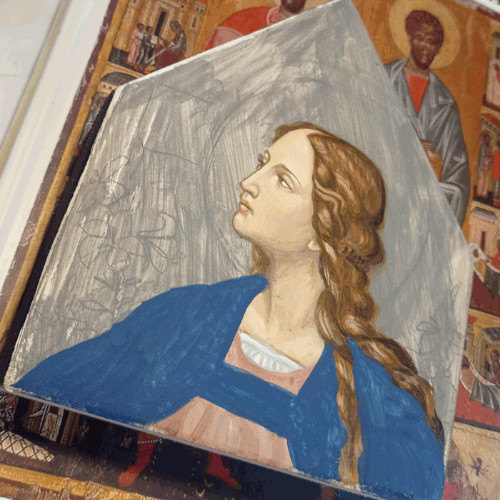 Ikona w formie kapliczki przedstawiająca Zwiastowanie o formacie 17x13x3 cm. Na obrazie widać ślady pędzla i gródki farby, które są naturalną pozostałością procesu. Obraz jest zabezpieczony werniksem matowym. Kolory na zdjęciu i w rzeczywistości mogą się nieznacznie różnić.