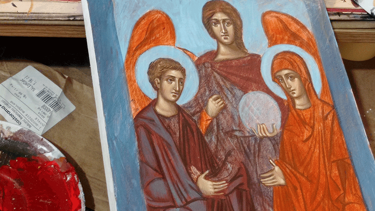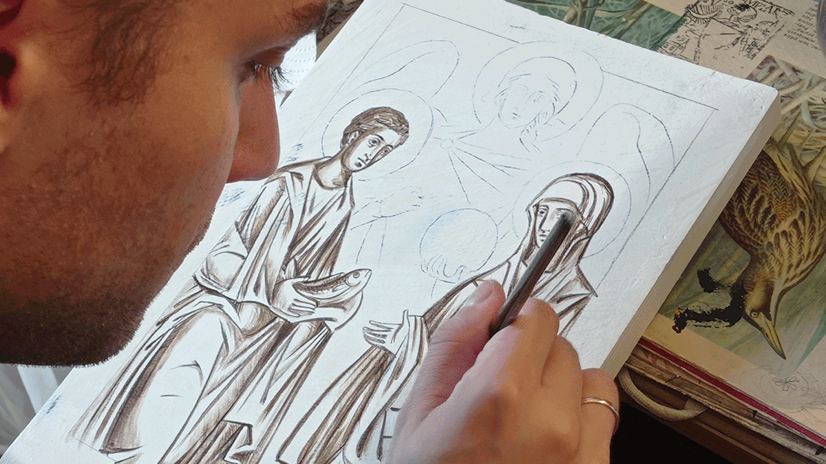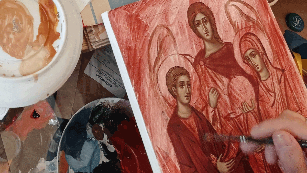 Decyzje te są przemyślanym efektem wielu prób i błędów: także ograniczenie kolorystyki do barw zgaszonych, piaskowych, ciepłych było decyzją podyktowaną doświadczeniem. Zrezygnowanie z intensywnego nasycenia doprowadziło do sytuacji, w której cała ikona wygląda na bardziej spójną kompozycyjnie: barwy na drewnie nie walczą ze sobą o dominację, lecz się wzajemnie dopełniają. Jakub umyślnie zrezygnował też ze złota, zastępując je pigmentami, które dają podobny efekt kolorystyczny.